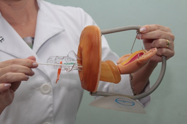 - a seguir, o profissional provoca uma pequena escamação da superfície externa e interna do colo do útero com uma espátula de madeira e uma escovinha;