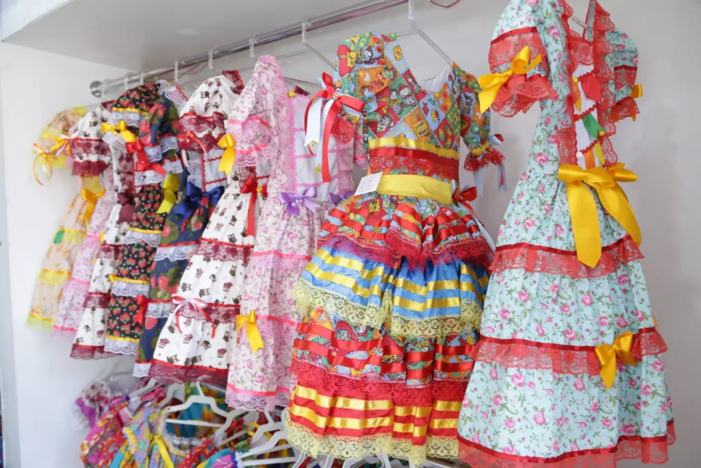 O comércio de roupas também é favorecido. Lojas populares e ateliês locais intensificam a produção de trajes juninos, especialmente vestidos coloridos, camisas xadrez, saias de chita e acessórios como tiaras, chapéus e lenços. O setor de tecidos também se beneficia, já que muitas famílias optam por confeccionar as próprias roupas ou reformar peças antigas.