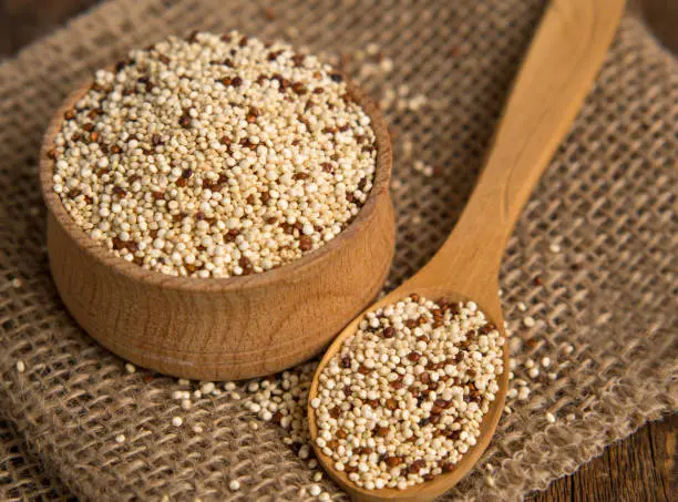 A quinoa (Chenopodium quinoa) contém ~16–18 % de proteína de alta qualidade, com todos os aminoácidos essenciais, além de fibras, ácidos graxos insaturados, vitaminas (B e E) e minerais como ferro, magnésio, zinco e fósforo. Uma xícara de quinoa cozida fornece cerca de 8 g de proteína, 5 g de fibra, além de micronutrientes relevantes.